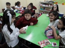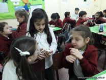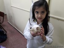Morena Crudo Moriondo, de 3ro A, trajo un cráneo de un animal carnívoro para compartir con sus compañeros. Los niños observaron y comentaron sus características.