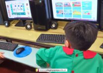 Los niños de sala de 5 años, tuvieron su visita a la sala de Computacion. Donde realizaron actividades de reconocimiento con las computadoras de escritorio y experimentaron con el mouse, diferentes juegos de memoria.
