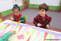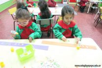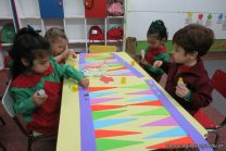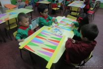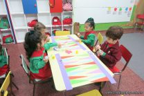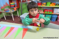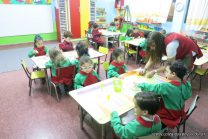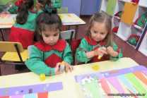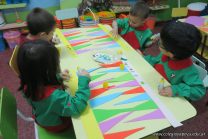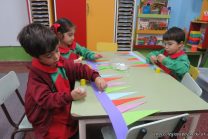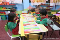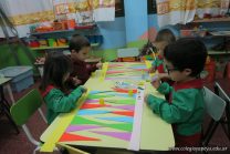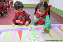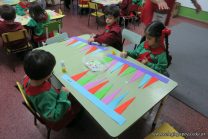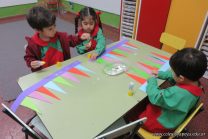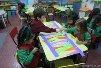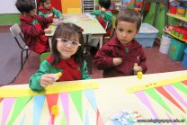Los alumnos de sala de 3 del turno tarde se prepararon para recibir y festejar la llegada de la Primavera. En este marco, la maestra propuso que decoren unos gorros arlequines realizados en goma eva.