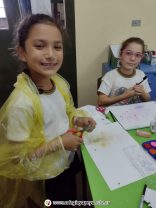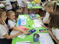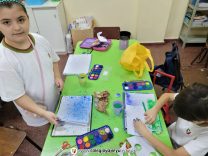 Los alumnos de 3er grado, en las clases de doble, aprendieron mucho sobre cómo trabajar con diversas maneras el punto como elemento plástico. Utilizaron la técnica de “estarcido” que es una forma de salpicado de puntitos de pintura sobre formas para lograr ilustraciones muy creativas. Los niños se asombraron y disfrutaron los resultados.