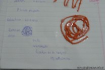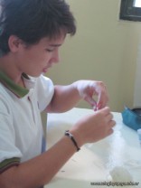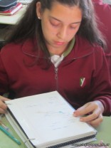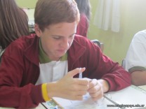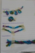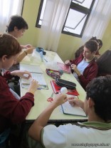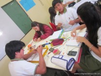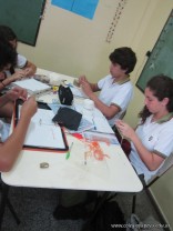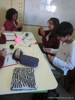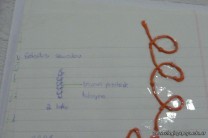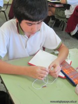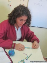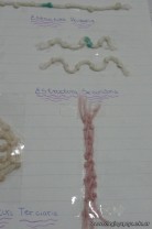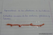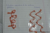 Los alumnos de 3er año, en el espacio curricular Fisico Quimica, reprodujeron las estructuras primarias, secundarias y terciarias de las proteinas con hebras de lana. Comenzaron con la secuencua de aminoacidos unidos por uniones peptidicas, representando con nudos a los aminoacidos. Luego pasaron a diferenciar la estructura secundaria y terciaria según se trate de proteínas globulares o fibrosas. Es impotante este tipo de representaciones ya que acerca a los alumnos al nivel molecular, que es difícil de comprender por su grado de abstracción.