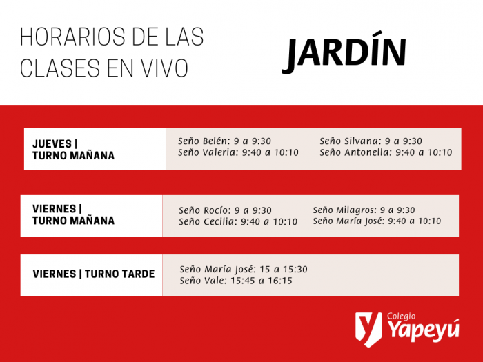 Compartimos los horarios de las clases en vivo del Jardín. Les pedimos que, antes, pasen por aquí para conocer todos los detalles de esta propuesta de la Educación Virtual.
