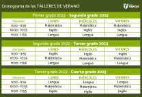 Compartimos los horarios de los talleres de las próximas semanas, que se realizarán en el Colegio. Enviamos toda la info necesaria en cuanto al protocolo de entrada y salida por e-mail y WhatsApp.