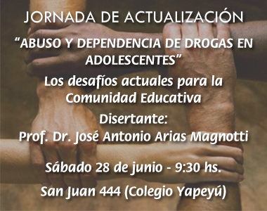 Por gentileza de la Asociación de Psiquiatras de Corrientes y la Asociación de Psiquiatría Infanto-Juvenil (filial Corrientes), en el marco del proyecto de prevención de adicciones de la Facultad de Medicina de la UNNE, se llevará a cabo en nuestro Colegio una conferencia acerca de: Abuso de drogas en adolescentes, los desafíos actuales para la comunidad educativa, a cargo del Dr. Prof. José Arias, psiquiatra de niños y adolescentes.