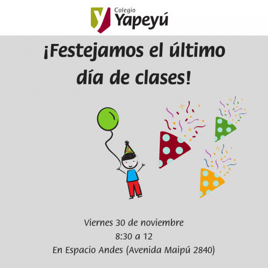 Este viernes 30 de noviembre se realizará un festejo por el fin del ciclo lectivo 2018. Será en Espacio Andes (Avenida Maipú 2840) de 8:30 a 12. ¡Estará presente toda la Primaria!